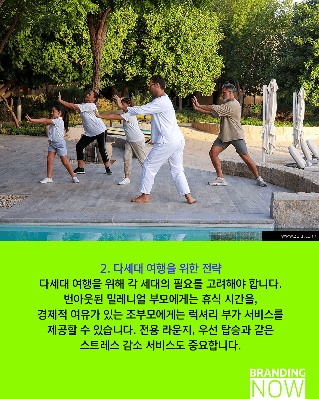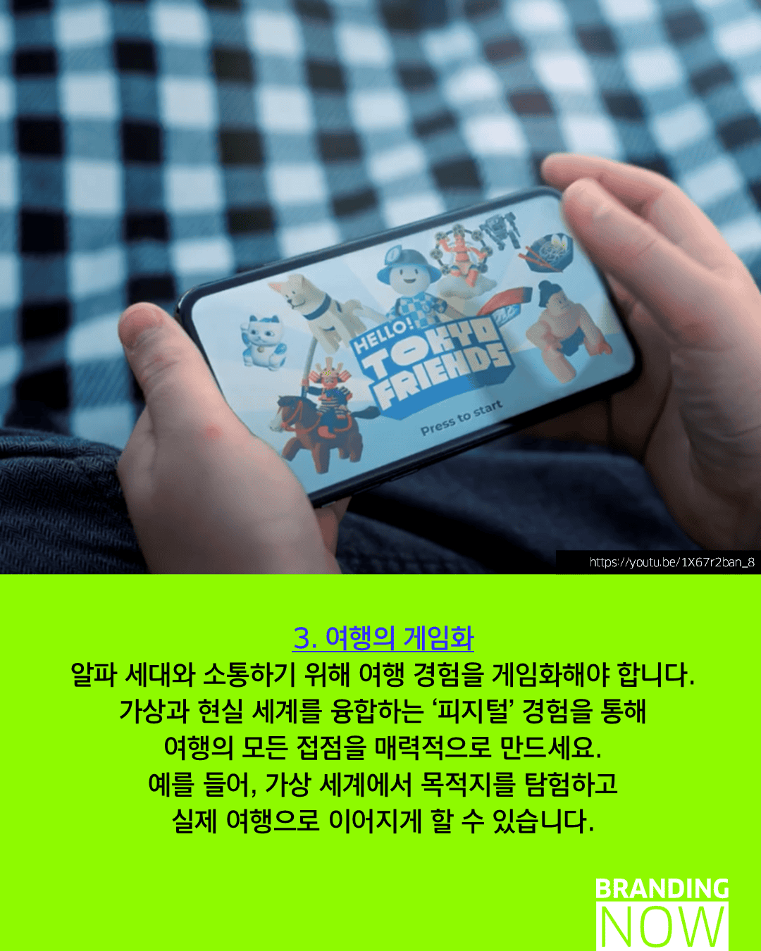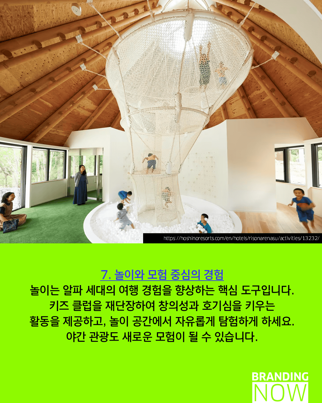 여행 경험의 게임화, 게이머를 위한 휴식 공간, 디지털 디톡스 여행, 놀이와 모험 중심의 키즈클럽 등 알파 세대의 호기심을 자극하고 책임감을 키우는 다양한 프로그램이 개발되고 있습니다. 특히 밀레니얼 부모는 엔터테인먼트와 스포츠, 문화 체험을 중심으로 여행을 계획합니다.