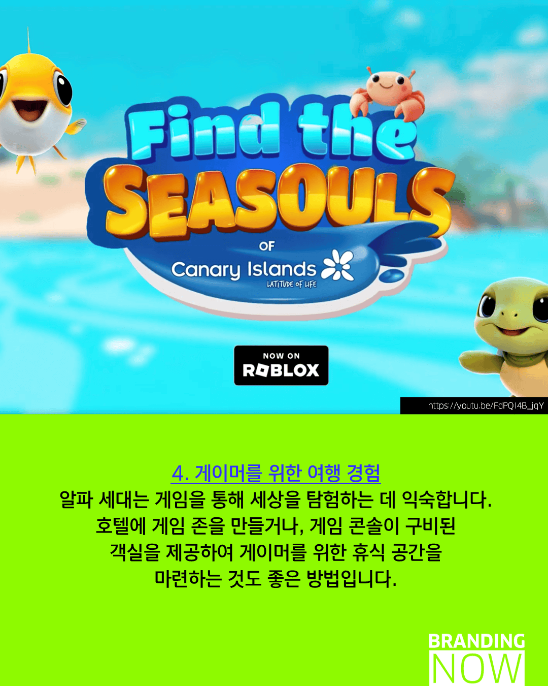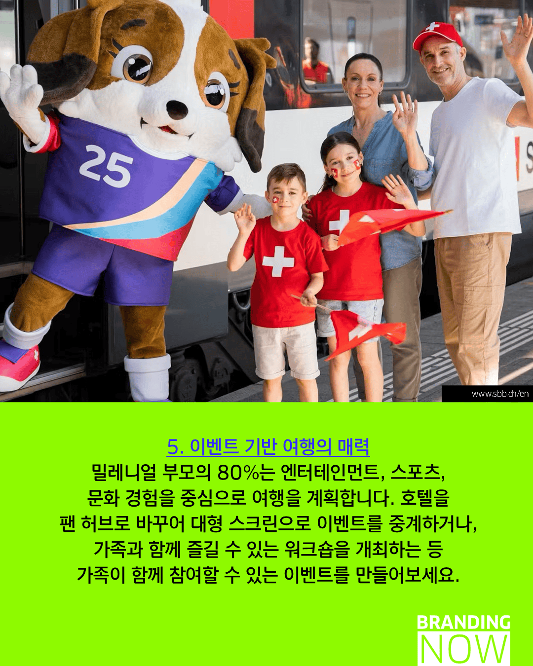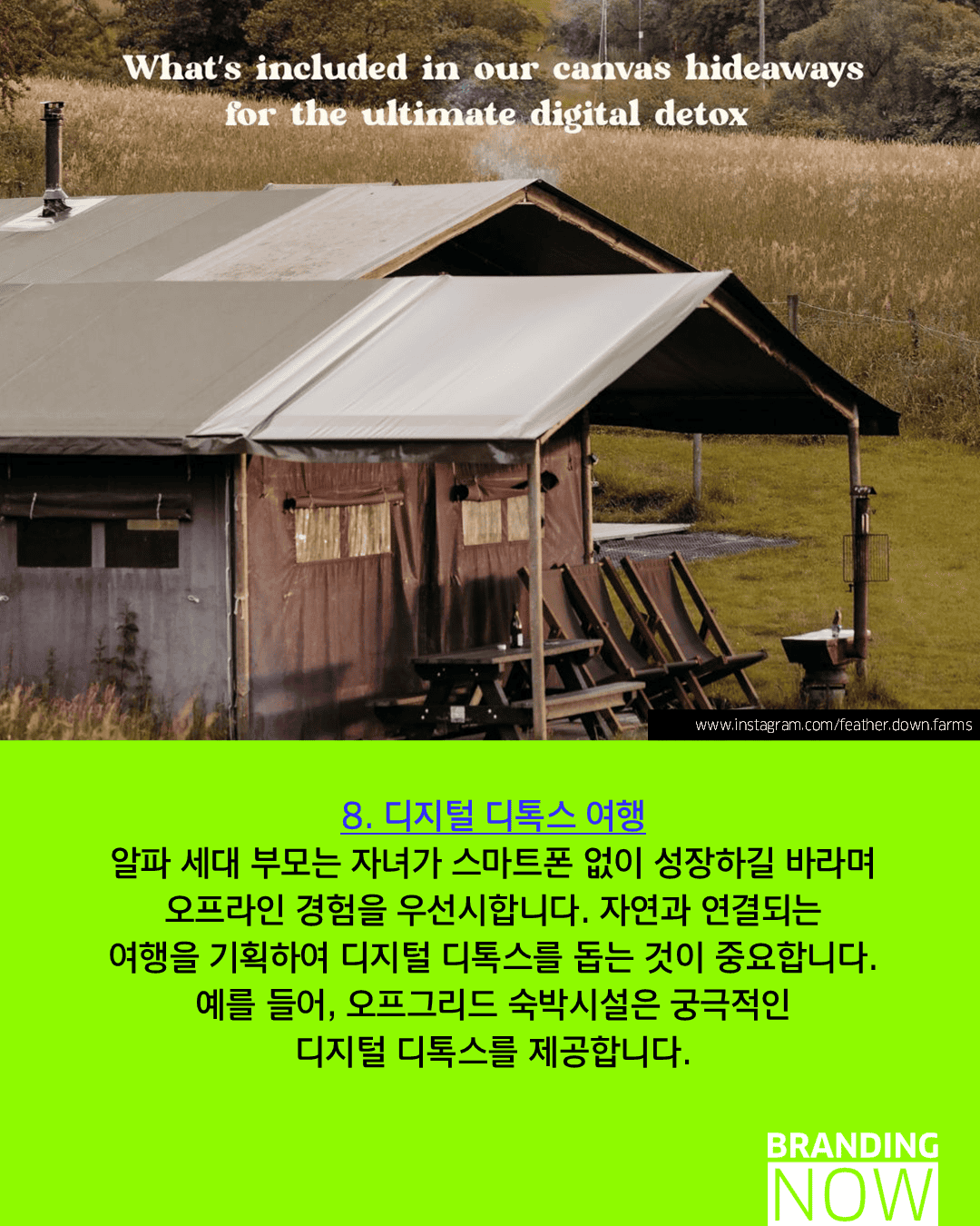 여행 경험의 게임화, 게이머를 위한 휴식 공간, 디지털 디톡스 여행, 놀이와 모험 중심의 키즈클럽 등 알파 세대의 호기심을 자극하고 책임감을 키우는 다양한 프로그램이 개발되고 있습니다. 특히 밀레니얼 부모는 엔터테인먼트와 스포츠, 문화 체험을 중심으로 여행을 계획합니다.