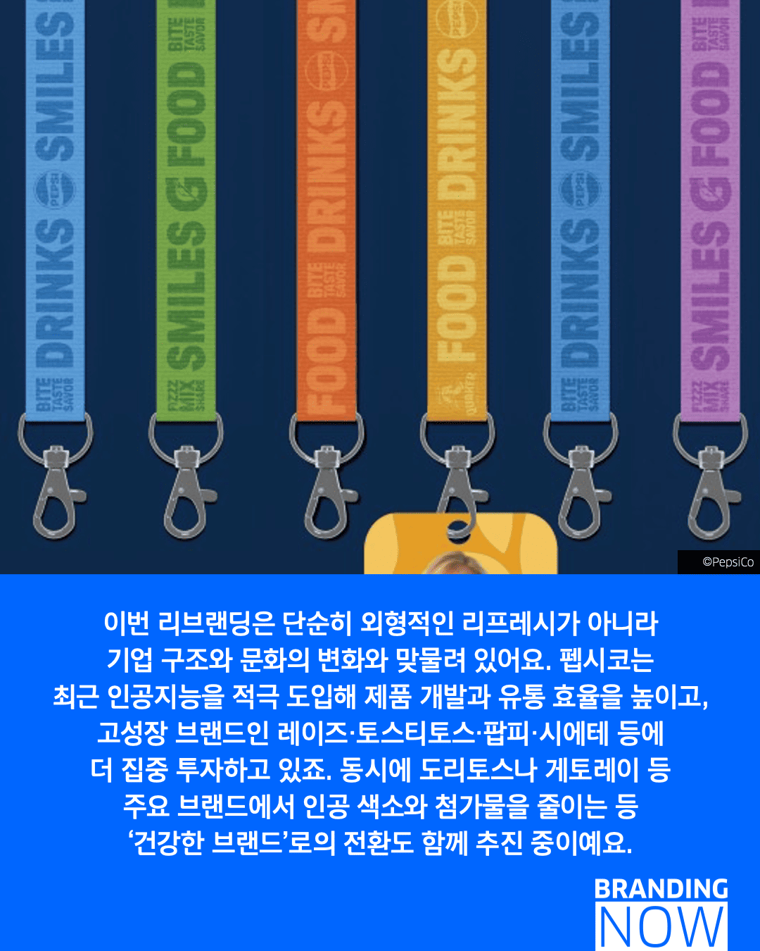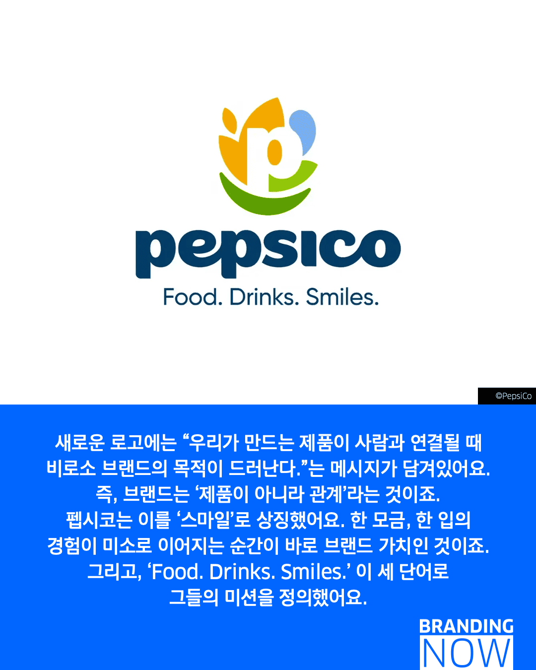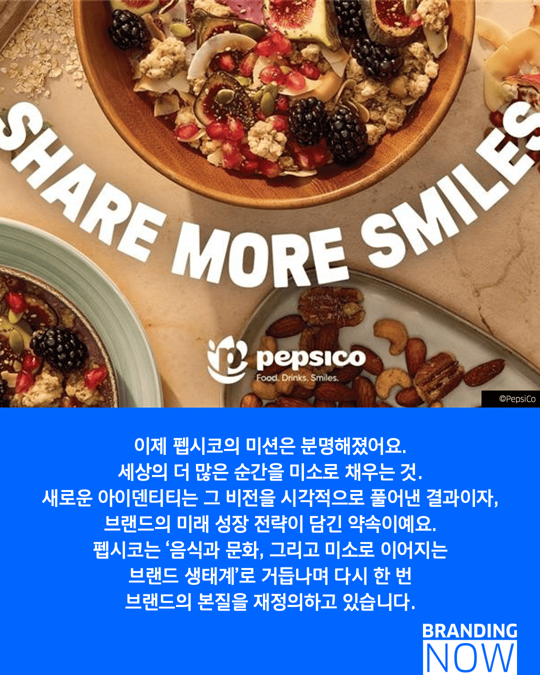 새로운 아이덴티티는 ‘Food. Drinks. Smiles.’라는 슬로건 아래, 식품, 음료, 그리고 지속가능성(Pep+)의 가치를 하나의 통합된 로고에 담았습니다. 이는 펩시 중심에서 벗어나 펩시코 전체의 새로운 내러티브를 구축하겠다는 선언입니다.