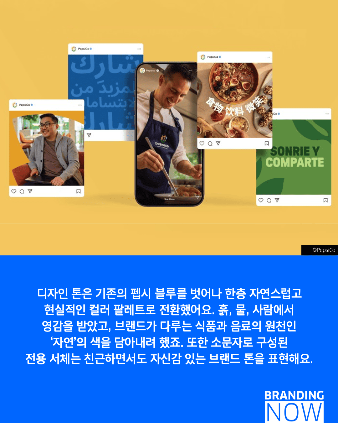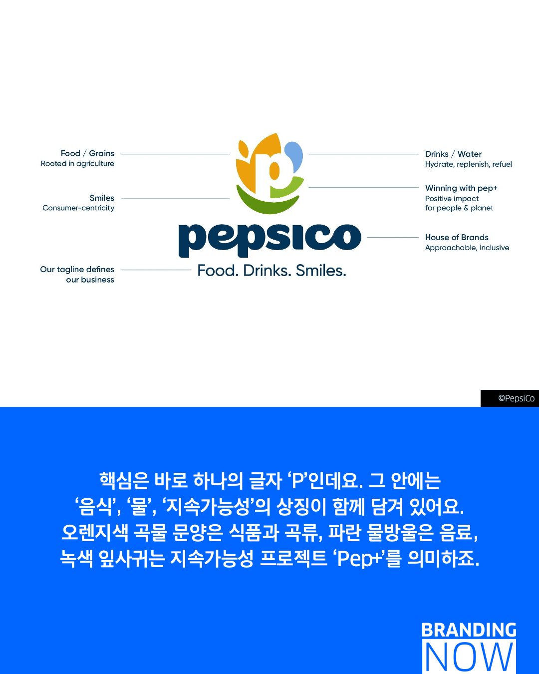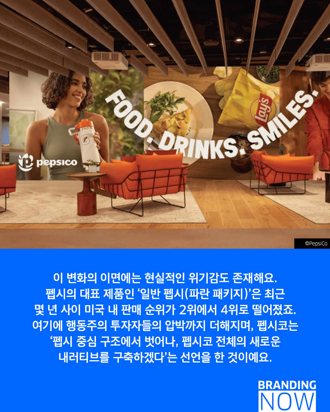 새로운 아이덴티티는 ‘Food. Drinks. Smiles.’라는 슬로건 아래, 식품, 음료, 그리고 지속가능성(Pep+)의 가치를 하나의 통합된 로고에 담았습니다. 이는 펩시 중심에서 벗어나 펩시코 전체의 새로운 내러티브를 구축하겠다는 선언입니다.