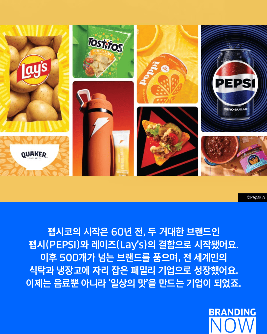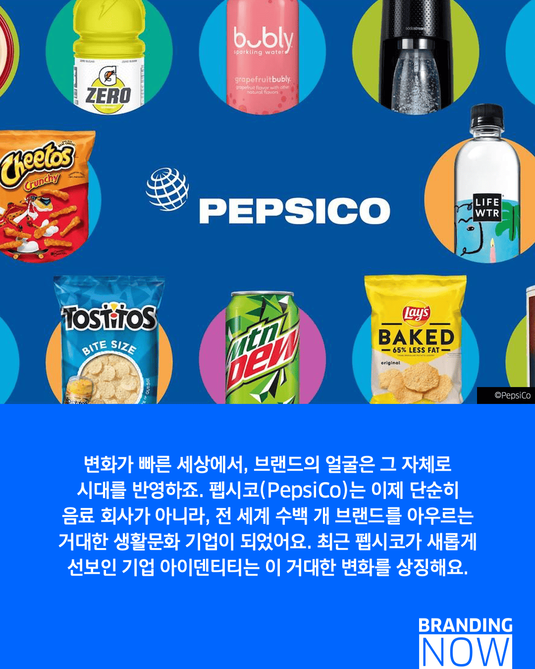 펩시코(PepsiCo)는 이제 단순한 음료 회사가 아닌 500개가 넘는 브랜드를 아우르는 거대한 생활문화 기업입니다. 하지만 ‘펩시 회사’로만 인식되는 한계를 극복하고 위기에 대응하기 위해, 25년 만의 대대적인 기업 아이덴티티 리뉴얼을 단행했습니다.