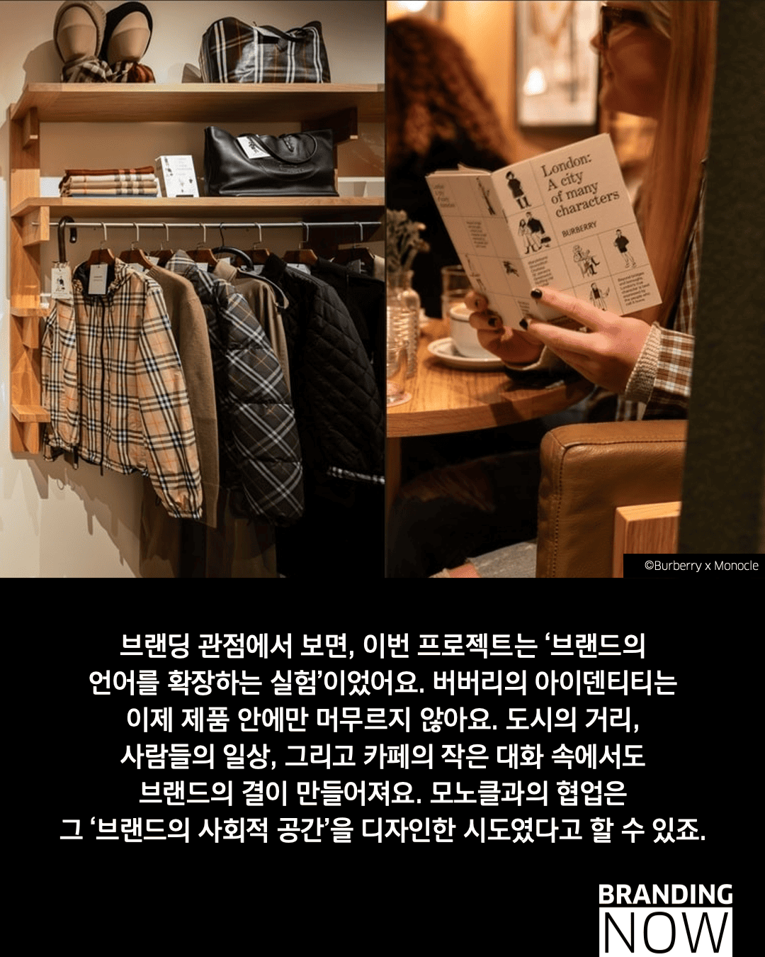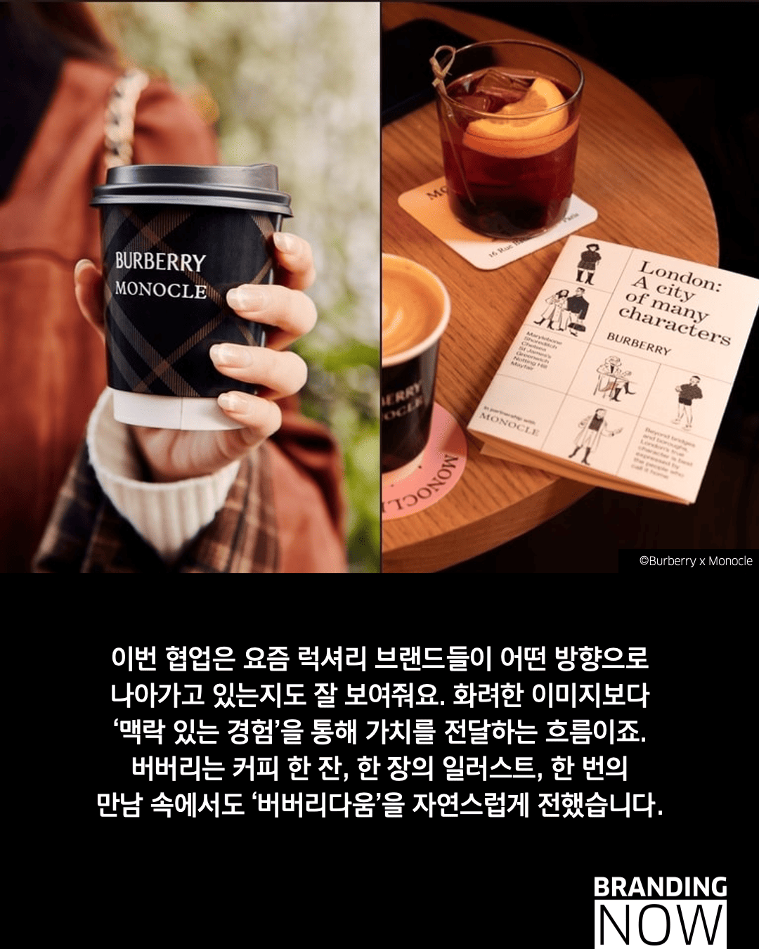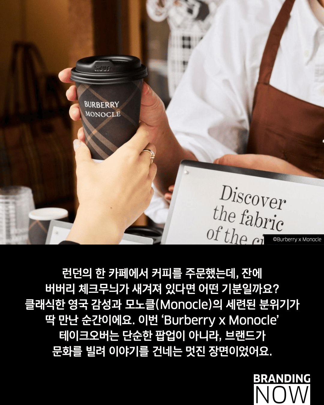 런던의 한 카페에서 커피를 주문했는데, 컵에 버버리 체크 무늬가 새겨져 있다면 어떤 기분일까요? 버버리(Burberry)는 모노클(Monocle)과의 협업을 통해 일상 속에서 브랜드의 감성을 오롯이 느낄 수 있는 새로운 브랜드 경험 확장 사례를 선보였습니다.
