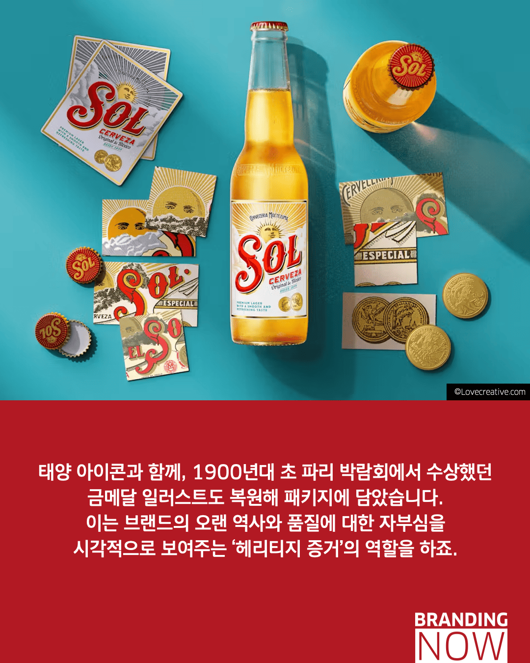 SOL은 브랜드명인 ‘태양(Sol)’의 스토리를 극대화하는 데 집중했습니다. 태양 아이콘과 과거의 수상 기록 등 헤리티지 디자인 요소를 복원하고, 멕시코 특유의 낙관적이고 활기찬 컬러를 더해 새로운 태도를 구축했습니다.