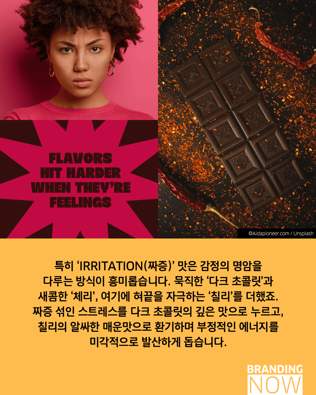 이 브랜드는 심리학 연구를 바탕으로 감정의 파동을 정교한 맛과 비주얼로 설계했습니다. ‘행복’은 상큼한 화이트 피치와 라임 요거트로 경쾌한 에너지를, ‘짜증’은 묵직한 다크 초콜릿과 체리에 칠리를 더해 부정적 에너지를 발산하도록 돕습니다.