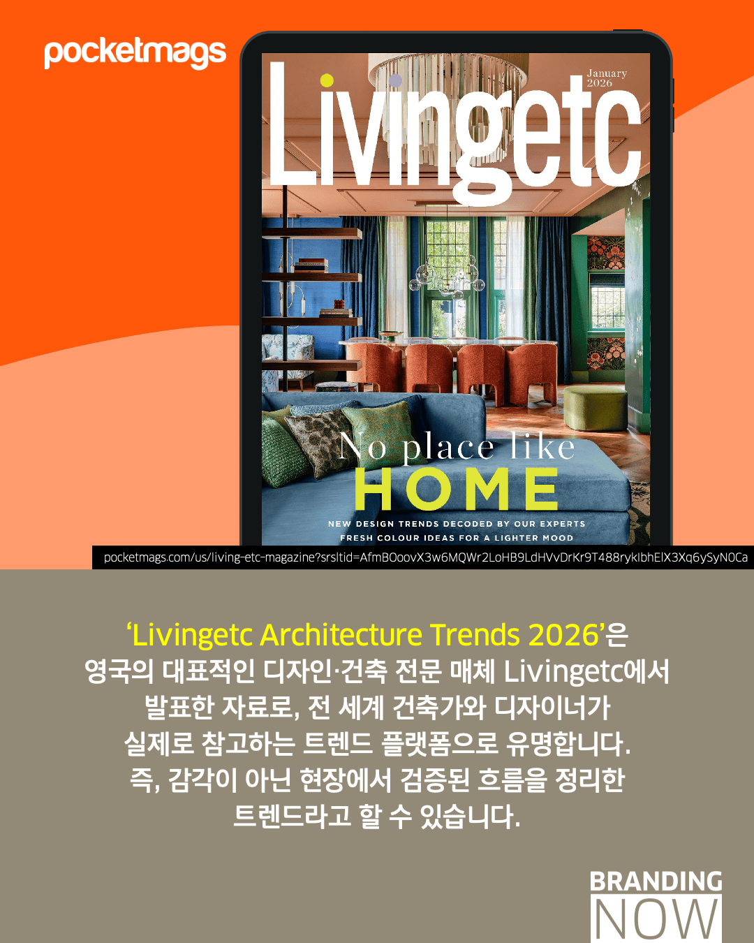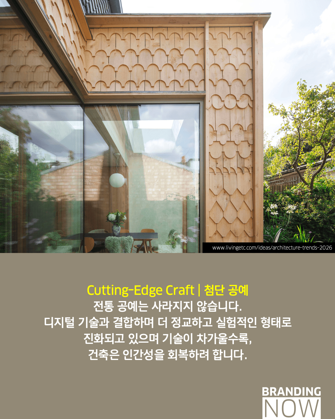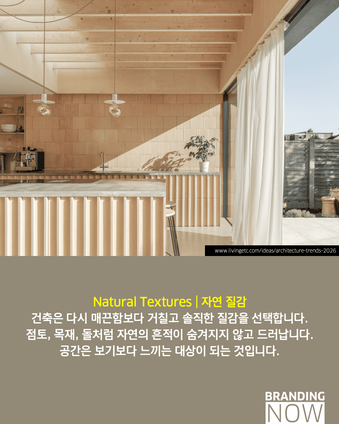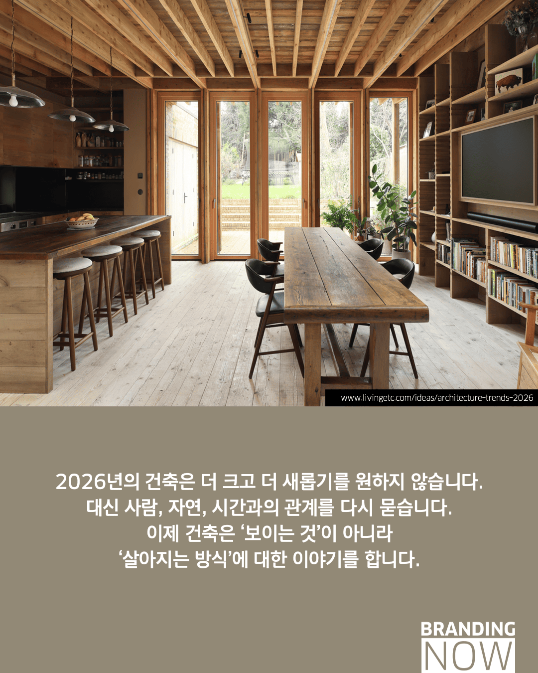 디자인·건축 전문 매체 Livingetc는 미래 건축의 핵심을 ‘인간성 회복’으로 정의했습니다. 기술이 고도화될수록 자연의 흔적과 손의 감각을 강조하는 2026 건축 트렌드의 주요 흐름을 소개합니다.