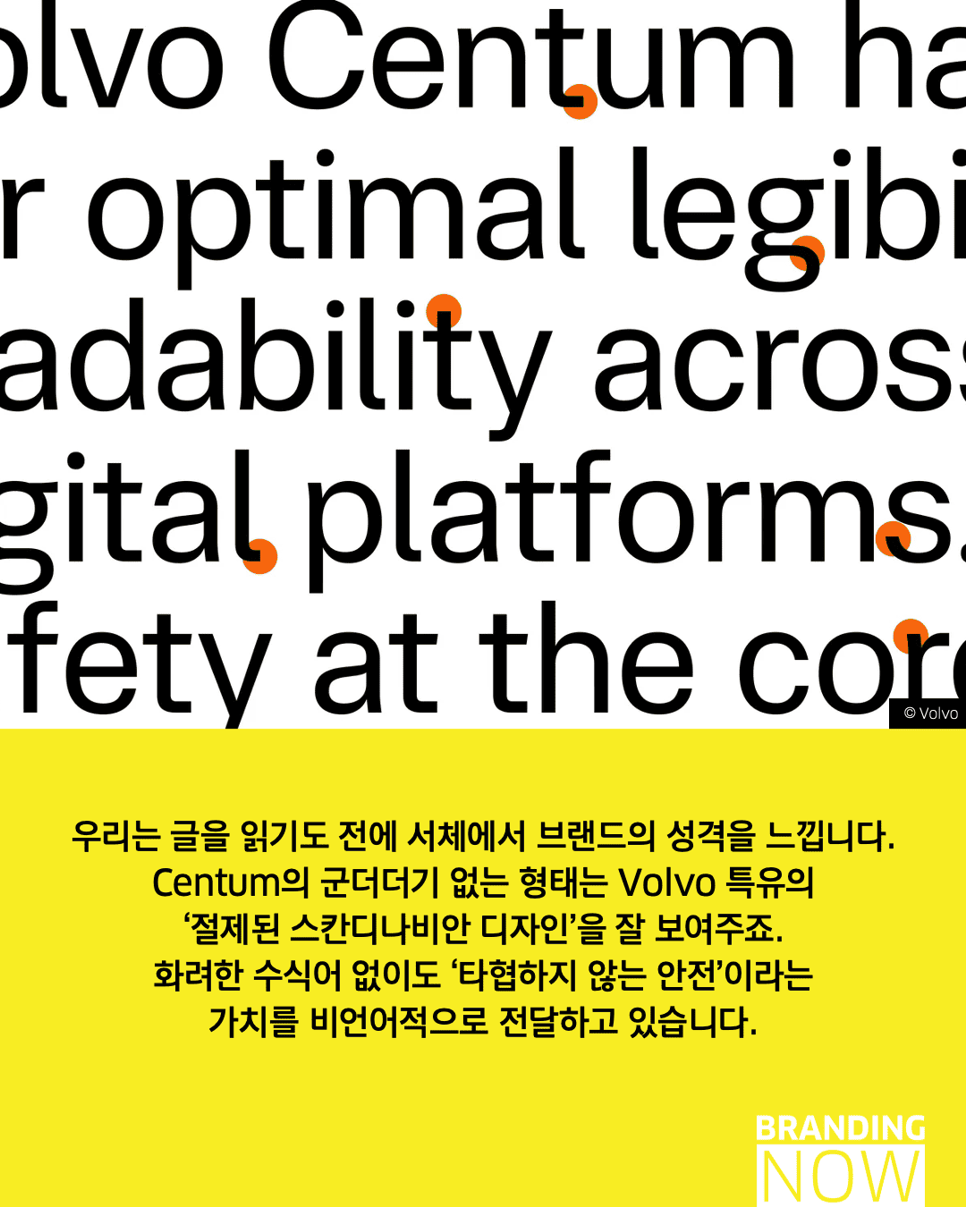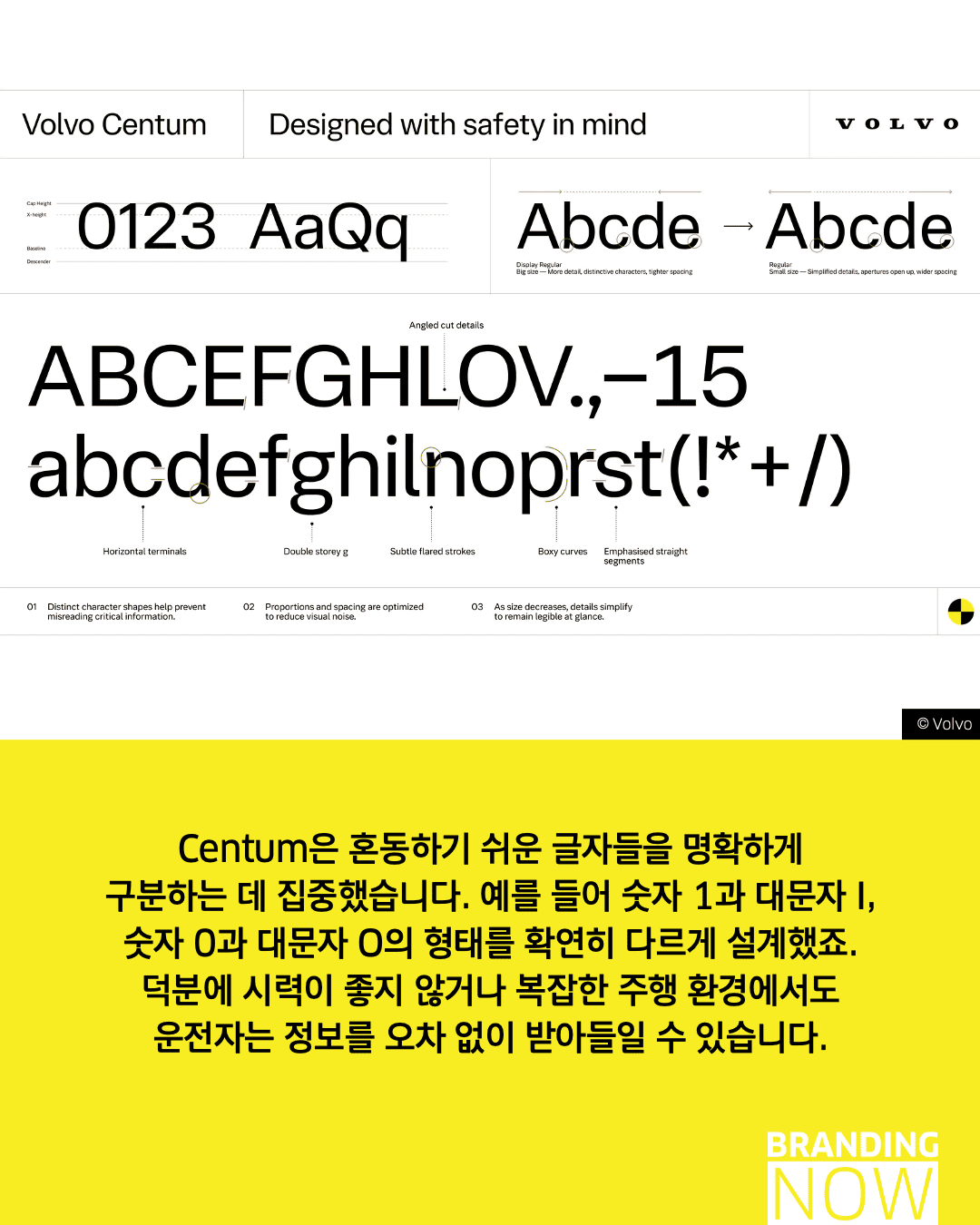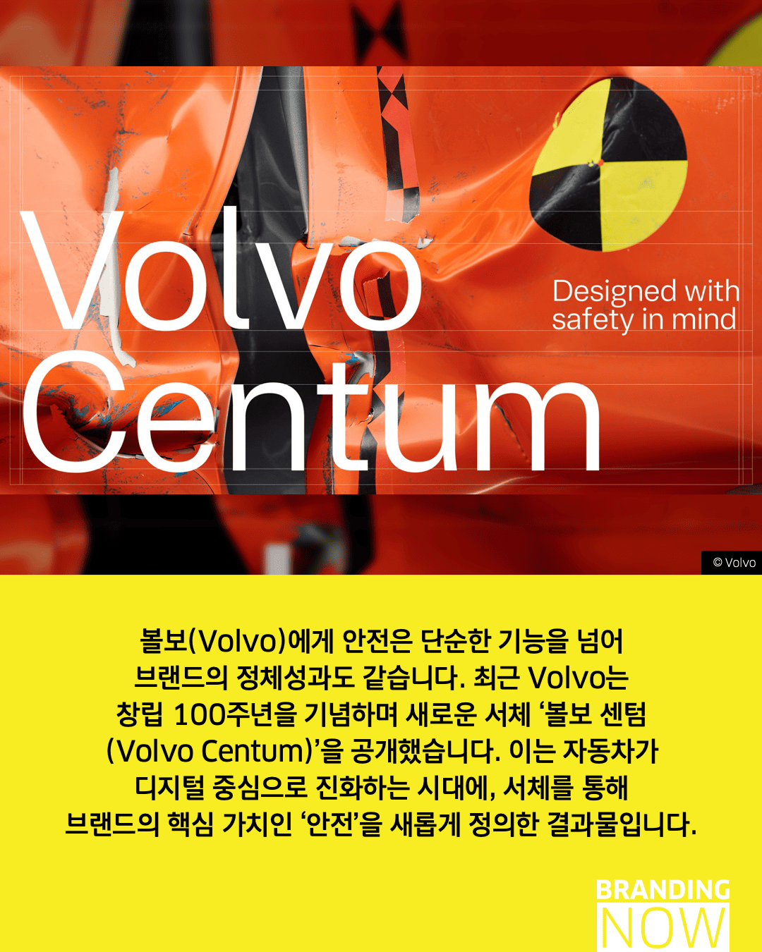 디자인은 단순히 보기 좋은 것을 넘어 생명을 구하는 도구가 될 수 있습니다. 볼보(Volvo)의 ‘볼보 센텀(Volvo Centum)’은 브랜드의 핵심 가치인 안전을 시각화한 안전을 위한 타이포그래피의 대표적 사례입니다.