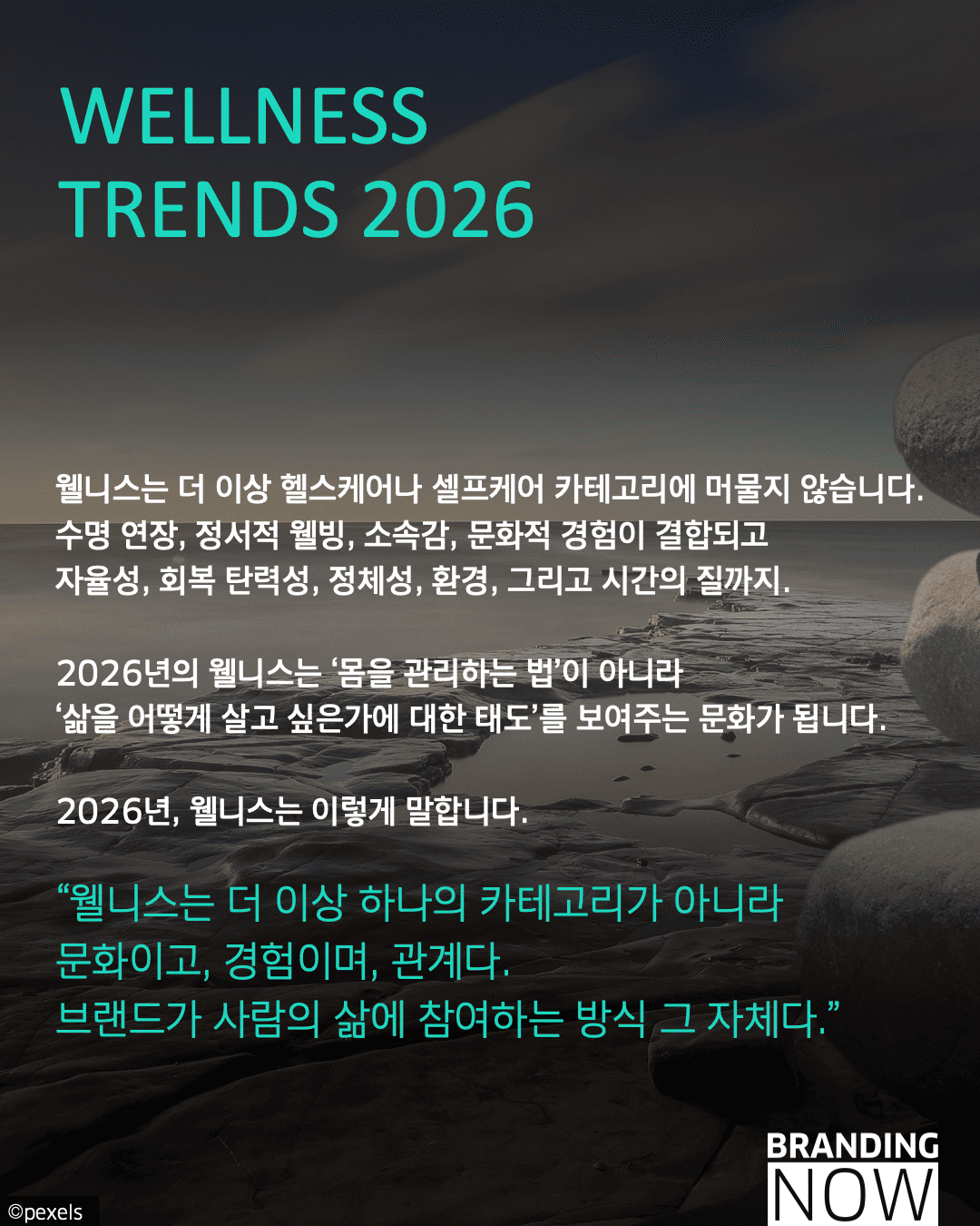 2026년의 웰니스는 더 이상 단순한 건강관리나 셀프케어 카테고리에 머물지 않습니다. 수명 연장과 정서적 안녕, 그리고 관계의 질까지 포괄하며 ‘삶을 어떻게 살고 싶은가’에 대한 태도를 보여주는 하나의 거대한 문화로 진화하고 있습니다.
