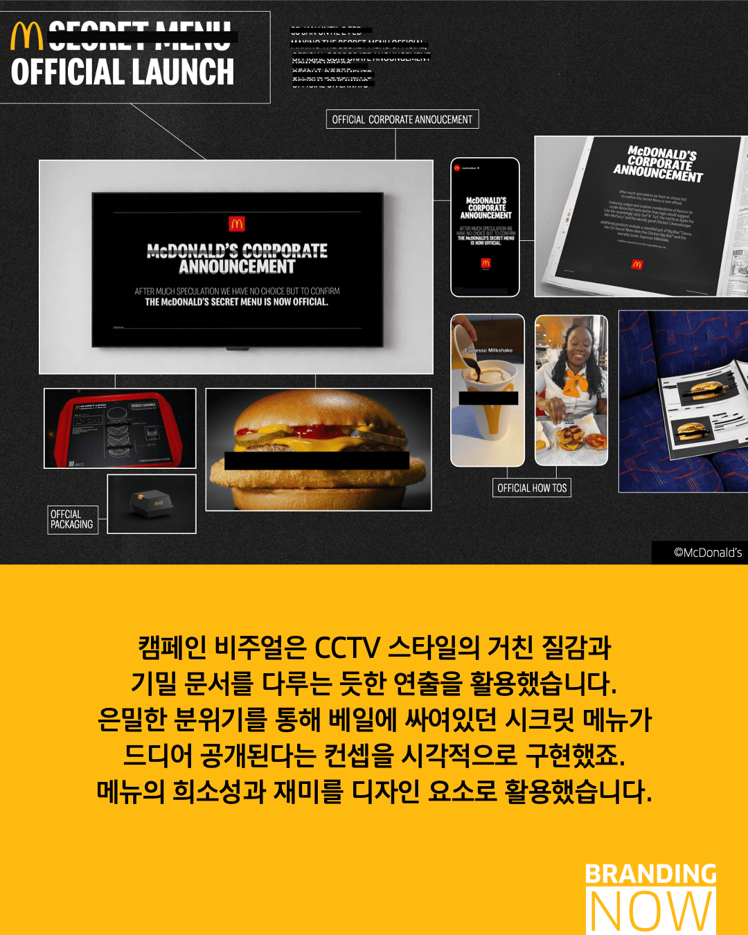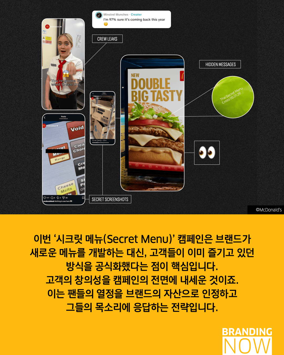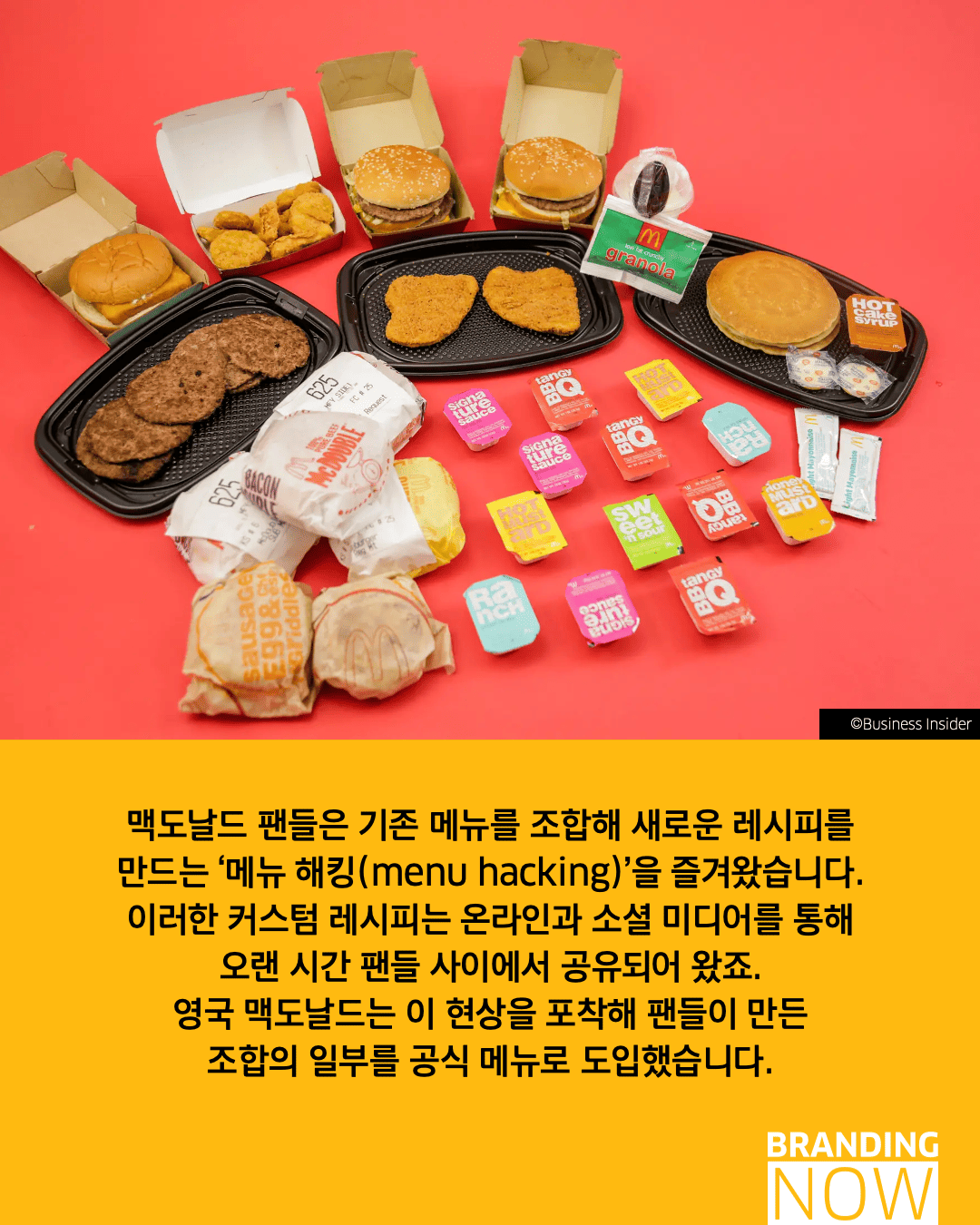 맥도날드는 새로운 메뉴 개발 대신 온라인에서 검증된 인기 조합을 공식화하여 팬들의 목소리에 즉각적으로 응답했습니다. 특히 재료를 개별 제공해 고객이 직접 조립하게 함으로써, 팬들이 즐기던 ‘메뉴 해킹’의 손맛과 참여의 즐거움을 매장 경험으로 확장했습니다.