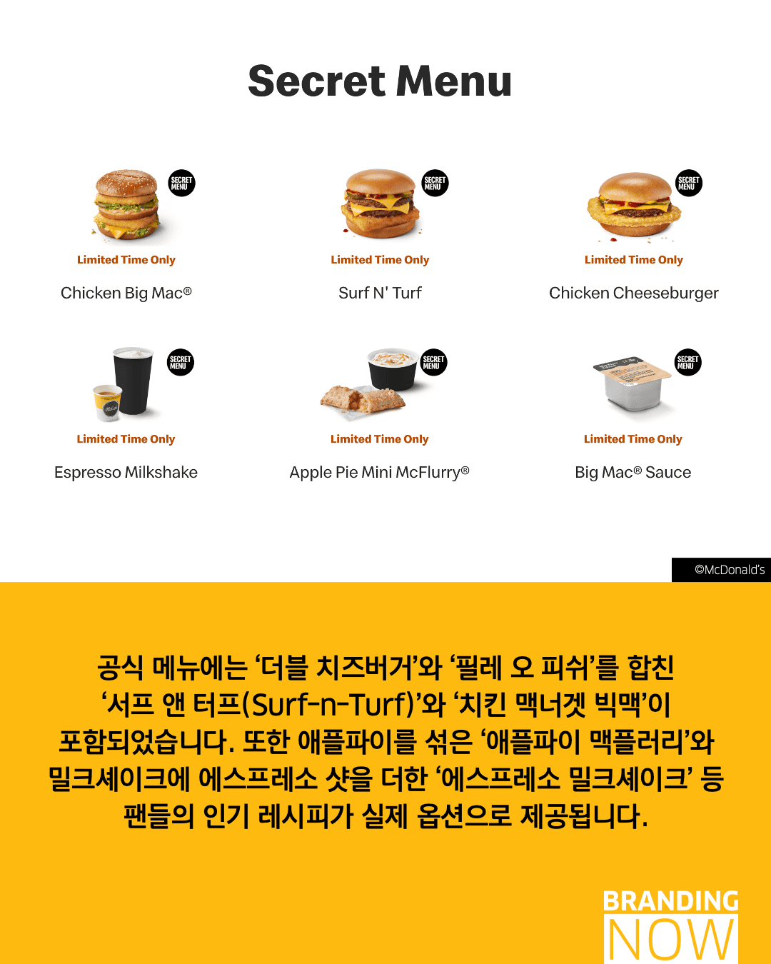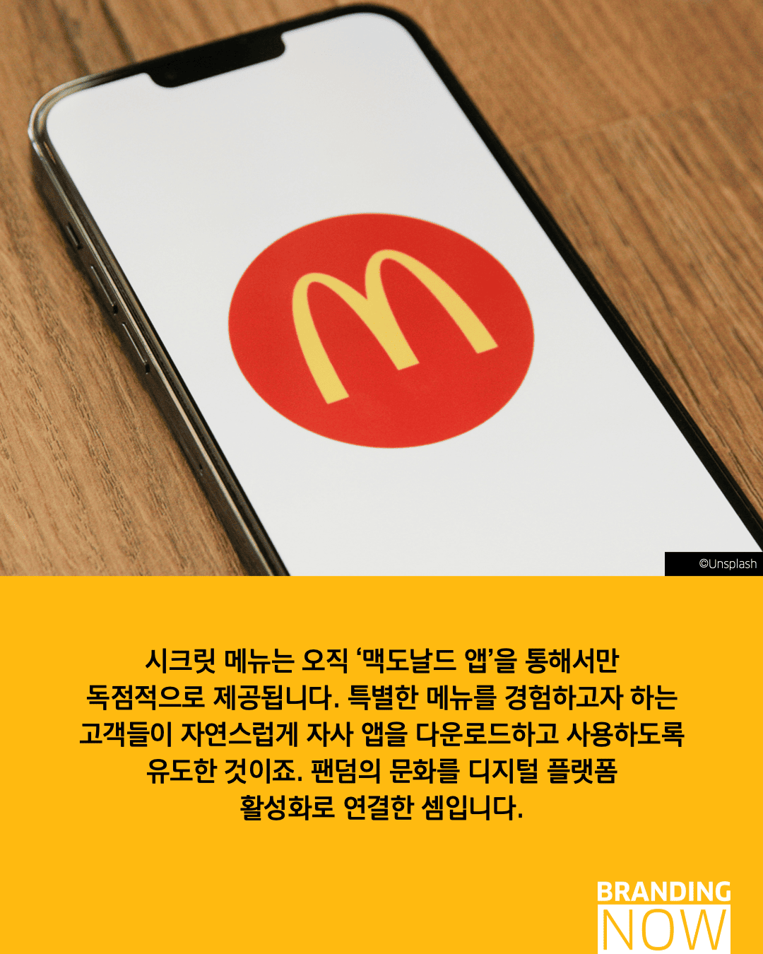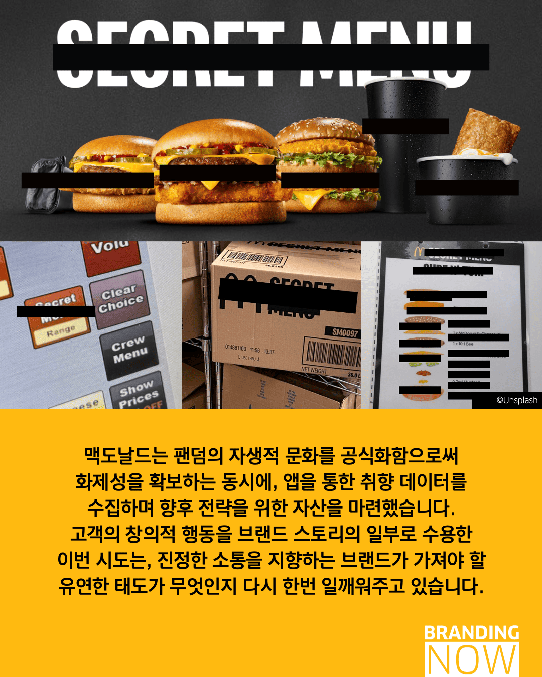 소비자가 직접 새로운 조합을 제안하는 커스텀 레시피 문화가 외식 업계의 강력한 마케팅 동력이 되고 있습니다. 영국 맥도날드의 ‘시크릿 메뉴’ 캠페인은 팬들의 암묵적 레시피를 정식 메뉴로 채택하며 고객의 창의성을 브랜드 자산으로 전환한 팬덤 마케팅의 정수를 보여줍니다.