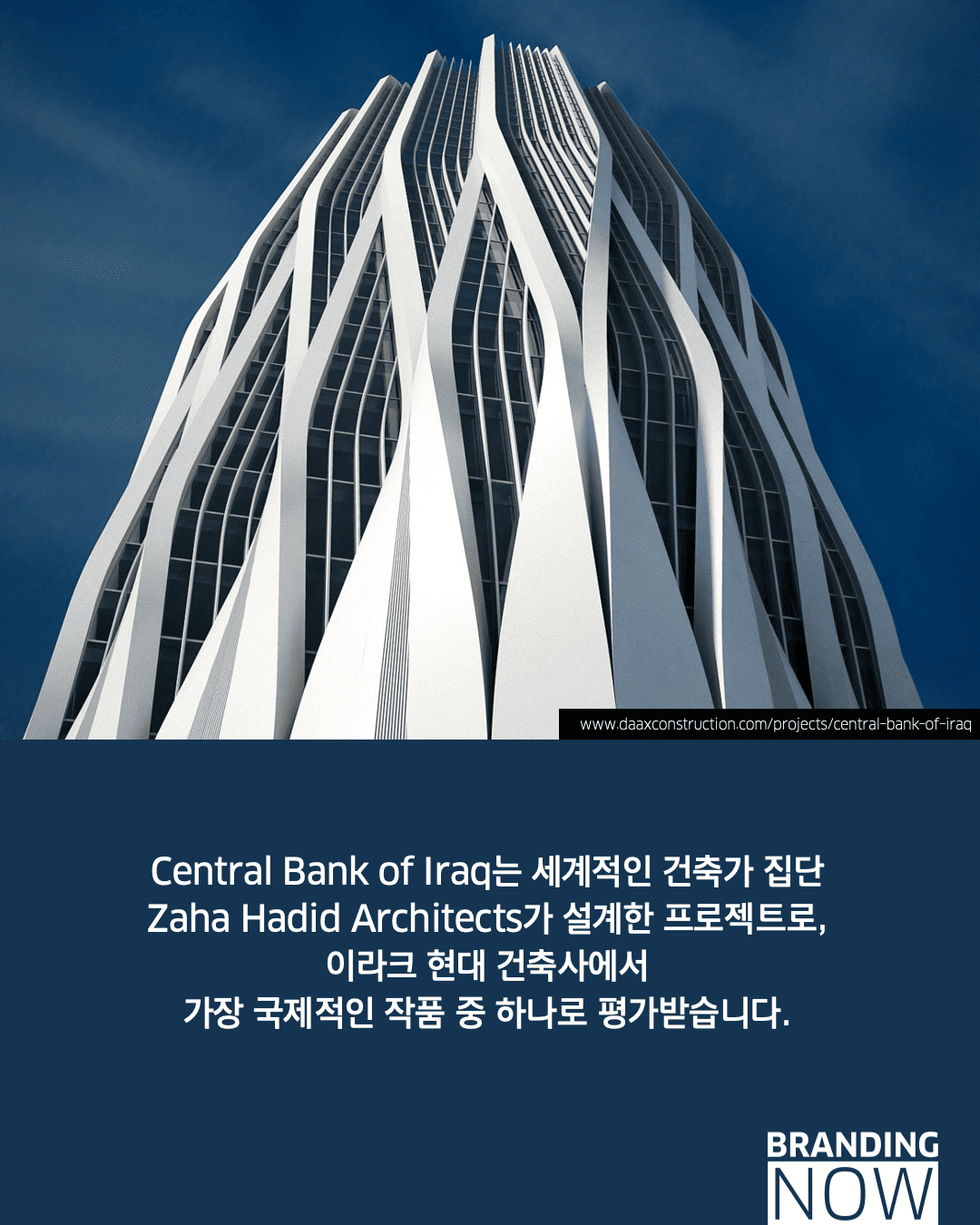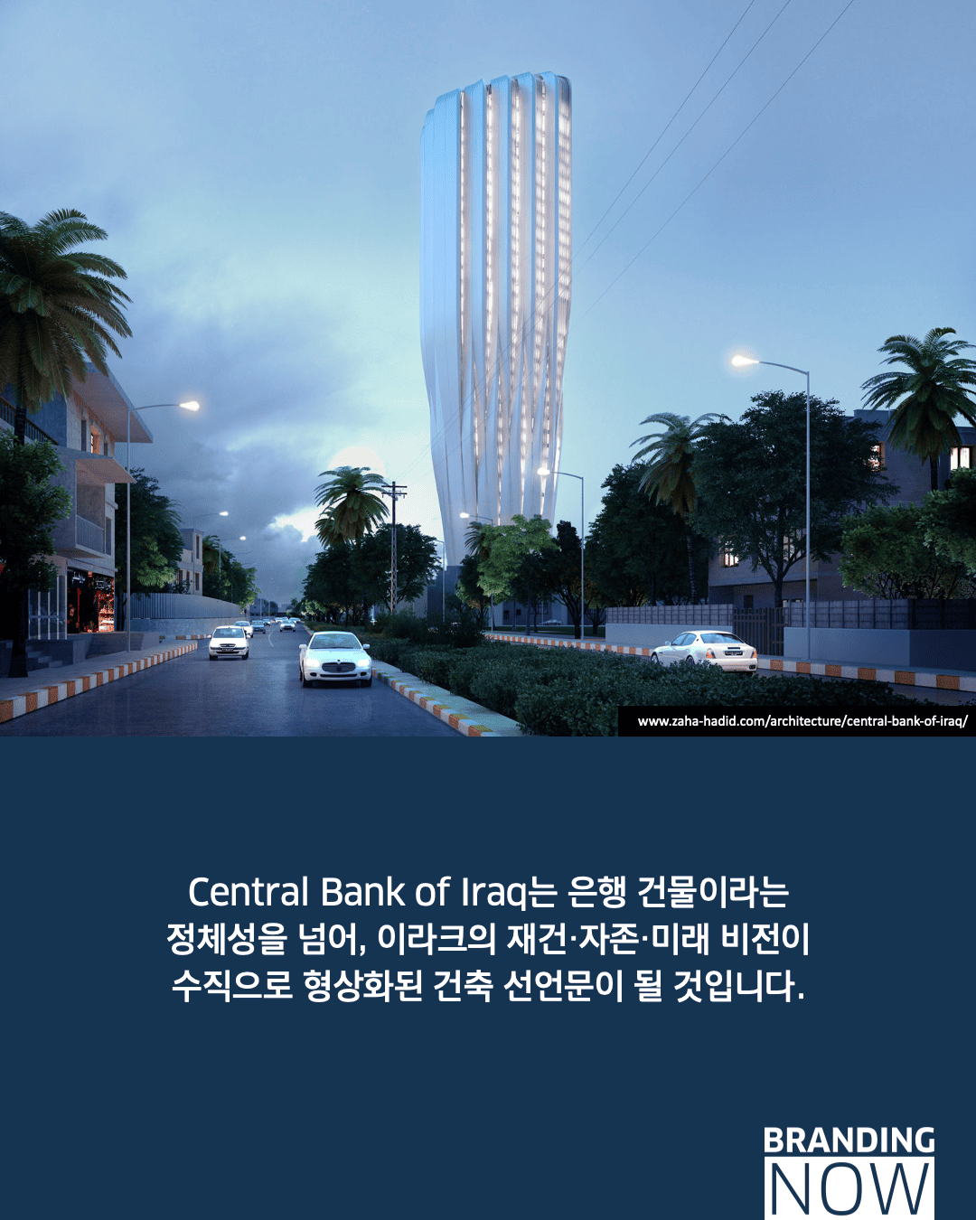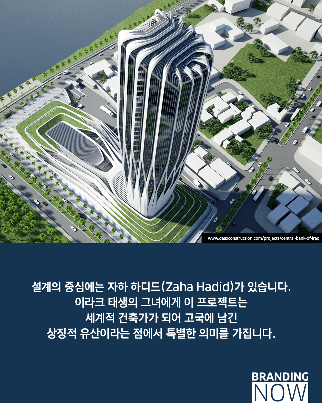 이 프로젝트는 자하 하디드가 고국에 남긴 유산으로, 금융의 안정성을 뜻하는 수직 구조와 경제의 유연성을 상징하는 곡선 외피를 조화시켰습니다. 단순한 건물을 넘어 이라크의 재건을 형상화한 이 건축물은 존재 자체로 강력한 국가 비전 선언문이 됩니다.
